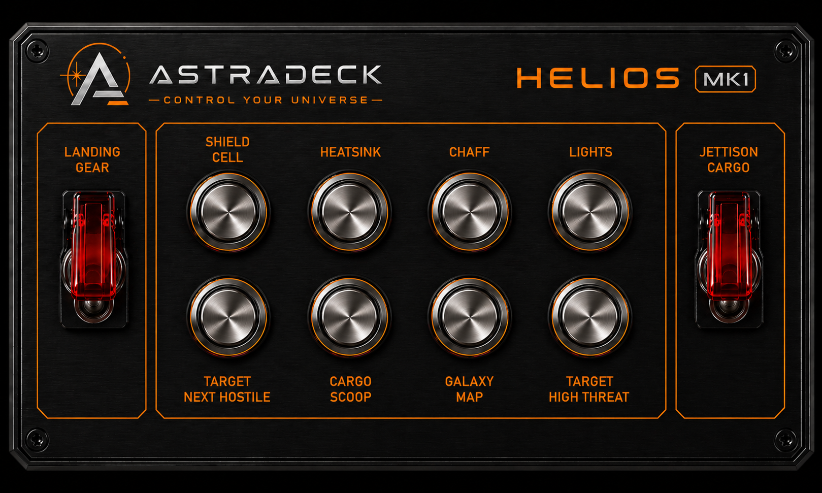 Take control with a compact cockpit-style interface featuring metal push buttons, protected toggle switches, and custom keybind support.
